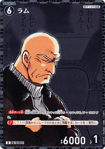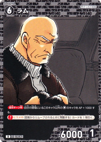 ![]() ![]() | D07011 ラム キャラクター Case-ThemeDeck 02 黒ずくめの組織 D 色:黒 レベル:6 AP:6000 LP:1 特徴:黒ずくめの組織 【自分ターン中】自分の現場にいるこのキャラ以外の黒のキャラをAP+1000する。 【ヒラメキ】(証拠からリムーブされるときに発動する)カードを1枚引く。 |