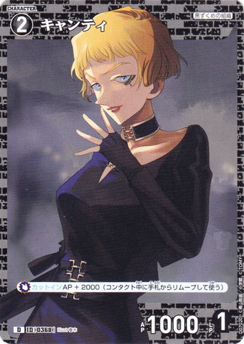 ![]() ![]() | D07020 キャンティ キャラクター Case-ThemeDeck 02 黒ずくめの組織 D 色:黒 レベル:2 AP:1000 LP:1 特徴:黒ずくめの組織 【カットイン】AP+2000(コンタクト中に手札からリムーブして使う) |