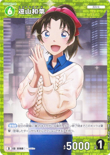 ![]() ![]() | D06006 遠山和葉 キャラクター Case-ThemeDeck 01 服部平次VS怪盗キッド D 色:緑 レベル:6 AP:5000 LP:1 特徴:高校生 【登場時】自分の現場に白のキャラがいる場合、ターン終了時までこのキャラは突撃(登場したターンからすぐにアクションできる)を持つ。 illust:hiro |