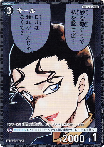 ![]() ![]() | D07016 キール キャラクター Case-ThemeDeck 02 黒ずくめの組織 D(foil) 色:黒 レベル:3 AP:2000 LP:1 特徴:黒ずくめの組織 ミスリード1(相手の推理に対し、スリープさせることでLP-1する) 【カットイン】AP+1000(コンタクト中に手札からリムーブして使う) |