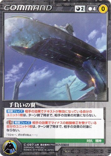 ![]() ![]() | C-097 手負いの翼 COMMAND OGクルセイド 第10弾 ~鋼鉄の鼓動~ U 色:黒 コスト[指定/合計(資源)]:黒2/4(0) G:青/黒 特徴:対抗/精神 【戦闘フェイズ】相手の効果でテキストが無効になっている自分のユニット1枚は、ターン終了時まで、相手の効果の対象にならない。 【信頼】【戦闘フェイズ】相手の効果でマイナスの戦闘修正を受けている自分のユニット1枚は、ターン終了時まで、相手の効果の対象にならない。 「うひゃー、ボロボロねぇ・・・」 出典:魔装機神III PRIDE OF JUSTICE |
