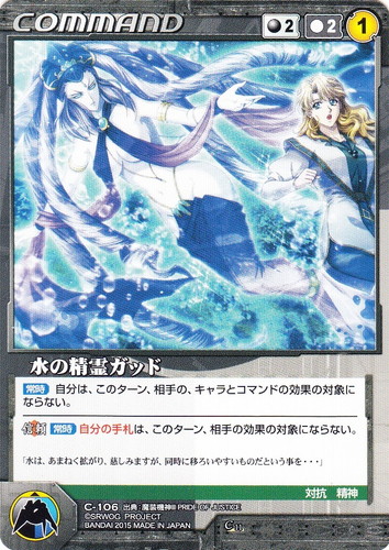 ![]() ![]() | C-106 水の精霊ガッド COMMAND OGクルセイド 第11弾 ~未来が導く戦士達~ C 色:黒 コスト[指定/合計(資源)]:黒2/2① G:青/黒 特徴:対抗/精神 【常時】自分は、このターン、相手の、キャラとコマンドの効果の対象にならない。 【信頼】【常時】自分の手札は、このターン、相手の効果の対象にならない。 「水は、あまねく拡がり、慈しみますが、同時に移ろいやすいものだという事を・・・」 出典:魔装機神III PRIDE OF JUSTICE |