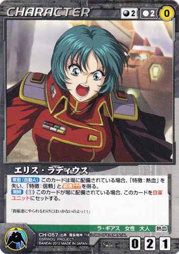 ![]() ![]() | CH-057 エリス・ラディウス CHARACTER OGクルセイド 第5弾 ~地球を護る剣~ C 色:黒 コスト[指定/合計(資源)]:黒2/2(0) G:青/黒 攻撃力:0 支援力:2 防御力:1 特徴:ラ・ギアス/女性/大人/熱血 【常駐(自動A)】このカードは場に配置されている場合、「特徴:熱血」を失い、「特徴:信頼」と装填(1)を得る。 【常時】《①》このカードが場に配置されている場合、このカードを自軍ユニットにセットする。 「貴様達にやられるわけにはいかないのよっ!!」 出典:魔装機神 THE LOAD OF ELEMENTAL |