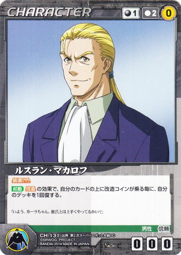 ![]() ![]() | CH-131 ルスラン・マカロフ CHARACTER OGクルセイド 第9弾 ~破壊神転生~ C 色:黒 コスト[指定/合計(資源)]:黒1/2(0) G:青/黒 攻撃力:0 支援力:0 防御力:0 特徴:男性/信頼 装填(1) 【起動】改造の効果で、自分のカードの上に改造コインが乗る毎に、自分のデッキを1回復する。 「いよう、カーラちゃん。彼氏とは上手くやってるかい?」 出典:第2次スーパーロボット大戦OG |