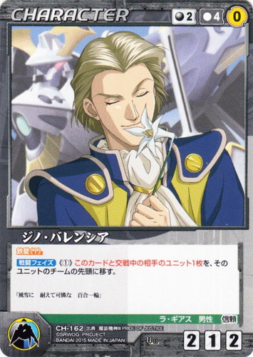 ![]() ![]() | CH-162 ジノ・バレンシア CHARACTER OGクルセイド 第11弾 ~未来が導く戦士達~ U 色:黒 コスト[指定/合計(資源)]:黒2/4(0) G:青/黒 攻撃力:2 支援力:1 防御力:2 特徴:ラ・ギアス/男性/信頼 鉄壁(1) 【戦闘フェイズ】《①》このカードと交戦中の相手のユニット1枚を、そのユニットのチームの先頭に移す。 「風雪に 耐えて可憐な 百合一輪」 出典:魔装機神III PRIDE OF JUSTICE |