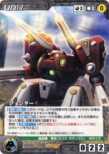 ![]() ![]() | U-066 フェンター UNIT OGクルセイド 第5弾 ~地球を護る剣~ C 色:黒 コスト[指定/合計(資源)]:黒2/2(0) G:青/黒 攻撃力:0 支援力:2 防御力:2 特徴:魔装機/Mサイズ 専用「エリス・ラディウス」 【【常駐(自動A)】このカードは、以下の特徴を持つ自軍キャラがいる場合、その特徴に対応するテキストを得る。 信頼:「【起動(自動D)】このカードが攻撃に出撃した、または交戦中となった場合、自軍本国を1回復する」 熱血:「【防御ステップ】《R①》戦闘エリアにいる敵軍ユニット1枚に2ダメージを与える」】 岩の精霊フェニールと契約した魔装機。後方支援を目的として開発された。 出典:魔装機神 THE LOAD OF ELEMENTAL illust:Shiori Hanazawa(WINKYSOFT) |