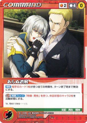 ![]() ![]() | C-108 あらぬ誤解 COMMAND OGクルセイド 第11弾 ~未来が導く戦士達~ C 色:赤 コスト[指定/合計(資源)]:赤2/4(0) G:緑/赤 特徴:支配/再生/精神 【常時】相手のカード1枚が持つ全ての特徴を、ターン終了時まで無効にする。 【信頼】【戦闘フェイズ】「特徴:男性」を持つ、休息状態のキャラ2枚を活動状態にする。 「お、男同士で何を・・・!?」 出典:魔装機神III PRIDE OF JUSTICE |