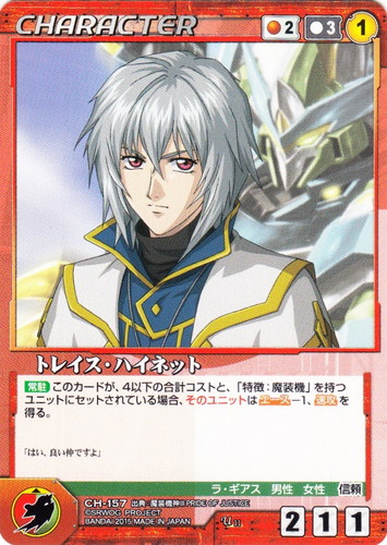 ![]() ![]() | CH-157 トレイス・ハイネット CHARACTER OGクルセイド 第11弾 ~未来が導く戦士達~ U 色:赤 コスト[指定/合計(資源)]:赤2/3① G:緑/赤 攻撃力:2 支援力:1 防御力:1 特徴:ラ・ギアス/男性/女性/信頼 【常駐】このカードが、4以下の合計コストと、「特徴:魔装機」を持つユニットにセットされている場合、そのユニットはエース-1、速攻を得る。 「はい、良い仲ですよ」 出典:魔装機神III PRIDE OF JUSTICE |