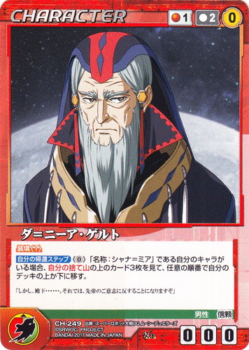 ![]() ![]() | CH-249 ダ=ニーア・ゲルト CHARACTER OGクルセイド 第17弾 ~皇家の真剣~ N 色:赤 コスト[指定/合計(資源)]:赤1/2(0) G:緑/赤 攻撃力:0 支援力:0 防御力:0 特徴:男性/信頼 装填(1) 【自分の帰還ステップ】《0》「名称:シャナ=ミア」である自分のキャラがいる場合、自分の捨て山の上のカード3枚を見て、任意の順番で自分のデッキの上か下に移す。 「しかし、殿下・・・・・・それでは、先帝のご意思に反することになりますぞ」 出典:スーパーロボット大戦OG ムーン・デュエラーズ |