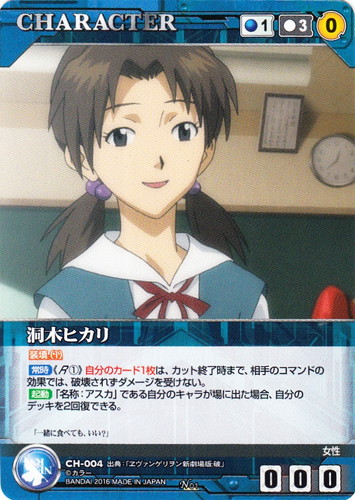 ![]() ![]() | CH-004 洞木ヒカリ CHARACTER クルセイド ヱヴァンゲリヲン新劇場版 N 色:青 コスト[指定/合計(資源)]:青1/3(0) G:青 攻撃力:0 支援力:0 防御力:0 特徴:女性 装填(1) 【常時】《R①》自分のカード1枚は、カット終了時まで、相手のコマンドの効果では、破壊されずダメージを受けない。 【起動】「名称:アスカ」である自分のキャラが場に出た場合、自分のデッキを2回復できる。 「一緒に食べても、いい?」 出典:ヱヴァンゲリヲン新劇場版・破 |