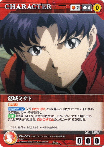 ![]() ![]() | CH-003 葛城ミサト CHARACTER クルセイド ヱヴァンゲリヲン新劇場版 N 色:赤 コスト[指定/合計(資源)]:赤2/4(0) G:赤 攻撃力:0 支援力:0 防御力:0 特徴:女性/NERV 装填(1) 【自分のターン】《R》自分の手札を1枚選んで、自分のデッキの下に移す。その場合、カード1枚を引く。 【起動】「特徴:NERV」を持つ自分のカードが、プレイされて場に出た、または解決された場合、自分の捨て山の上のカード1枚を引ける。 「だめよ、逃げちゃ。お父さんから・・・何よりも自分から」 出典:ヱヴァンゲリヲン新劇場版・序 |