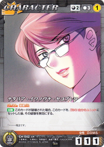 ![]() ![]() | CH-042 ナタリア・イワノヴナ・ヤコブレワ CHARACTER 【クルセイド】フルメタル・パニック! Novel Edition ~Second Mission~ N 色:黒 コスト[指定/合計(資源)]:黒2/3① G:黒 攻撃力:1 支援力:1 防御力:1 特徴:女性/D.O.M.S. ブースト 装填(1) 【起動】このカードが破壊された場合、このカードを、(別の)自分のユニットにセットした後、その破壊を無効にする。 「・・・・・・残念です」 出典:フルメタル・パニック!アナザー |