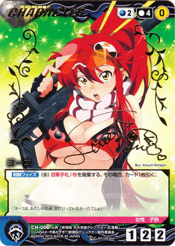 ![]() ![]() | CH-006 ヨーコ CHARACTER 【クルセイド】劇場版 天元突破グレンラガン プロモーションカード P(サイン) 色:青 コスト[指定/合計(資源)]:青2/4(0) G:青 攻撃力:1 支援力:2 防御力:2 特徴:女性/子供 【戦闘フェイズ】《0》自軍手札1枚を廃棄する。その場合、カード1枚を引く。 「ヨーコよ。あたしの名前、まだ言ってなかったでしょ」 出典:劇場版 天元突破グレンラガン 紅蓮篇 illust:Atsushi Nishigori |