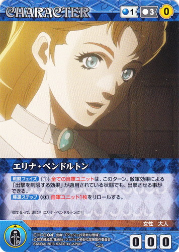 ![]() ![]() | CH-004 エリナ・ペンドルトン CHARACTER 【クルセイド】ジョジョの奇妙な冒険 C 色:青 コスト[指定/合計(資源)]:青1/3(0) G:青 攻撃力:0 支援力:0 防御力:0 特徴:女性/大人 【戦闘フェイズ】《①》全ての自軍ユニットは、このターン、敵軍効果による「出撃を制限する効果」が適用されている状態でも、出撃させる事ができる。 【帰還ステップ】《0》自軍ユニット1枚をリロールする。 「似てるって、誰に?エリナ・ペンドルトンに?」 出典:ジョジョの奇妙な冒険 |