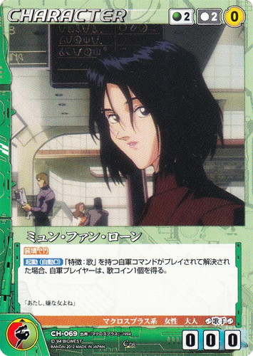 ![]() ![]() | CH-069 ミュン・ファン・ローン CHARACTER マクロスクルセイド 第6弾 ~超時空の歌姫~ C 色:緑 コスト[指定/合計(資源)]:緑2/2(0) G:緑/赤 攻撃力:0 支援力:0 防御力:0 特徴:マクロスプラス系/女性/大人/歌手 装填(1) 【起動(自動D)】「特徴:歌」を持つ自軍コマンドがプレイされて解決された場合、自軍プレイヤーは、歌コイン1個を得る。 「あたし、嫌な女よね」 出典:マクロスプラス |