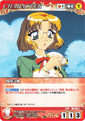 ![]() ![]() | CH-005 鳳凰寺風 CHARACTER 【クルセイド】魔法騎士レイアース C 色:青 コスト[指定/合計(資源)]:青1/4① G:青 攻撃力:1 支援力:1 防御力:3 特徴:女性/魔法騎士 【【起動】このカードがプレイされて場に出た場合、自分のデッキの上のカード3枚までを見て、その中にある、緑の指定コストと、「特徴:魔法騎士」「特徴:魔神」を持つカード1枚を、表にしてから自分の手札に移す事ができる。その後、残りを任意の順番で元のデッキの下に戻す】 「楽しそうなあなたを拝見して、わたくしも楽しませていただきましたから」 出典:魔法騎士レイアース |