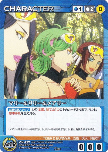![]() ![]() | CH-127 マリー&リリー&メアリー CHARACTER サンライズクルセイド エピソードブースターパック ~TIGER&BUNNY~ C 色:青 コスト[指定/合計(資源)]:青1/2(0) G:青 攻撃力:0 支援力:0 防御力:0 特徴:TIGER&BUNNY系/女性/大人/NEXT 【自軍攻撃ステップ】《R》本国、捨て山1つの上のカード3枚まで、または敵軍手札を全て見る。 「メアリーは金の匂いを嗅ぎ分ける、リリーは嘘を嗅ぎ分ける、私は危険を嗅ぎ分ける」 出典:TIGER&BUNNY |