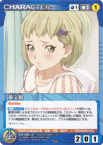 ![]() ![]() | CH-165 黄宝鈴 CHARACTER サンライズクルセイド エピソードブースターパック ~TIGER&BUNNY 第2弾~ R 色:青 コスト[指定/合計(資源)]:青1/3① G:青 攻撃力:2 支援力:0 防御力:1 特徴:TIGER&BUNNY系/女性/子供/NEXT ×「DRAGON KID」 パートナー 【戦闘フェイズ】《①》このカードがセットされているユニットが得ている、敵軍効果による全てのマイナスの戦闘修正を、このターン、無効にする。このカードがセットされているユニットが「発動状態」の場合、そのマイナスの戦闘修正を、無効にする代わりに、プラスの戦闘修正にする。 「恥ずかしいよぉ」 出典:TIGER&BUNNY |