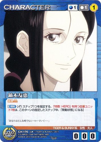 ![]() ![]() | CH-170 鏑木友恵 CHARACTER サンライズクルセイド エピソードブースターパック ~TIGER&BUNNY 第2弾~ U 色:青 コスト[指定/合計(資源)]:青1/1① G:青 攻撃力:0 支援力:0 防御力:0 特徴:TIGER&BUNNY系/女性/大人 装填 【【常時】《R》ステップ1つを指定する。「特徴:HERO」を持つ自軍ユニット1枚は、このターンの指定したステップ中、「発動状態」になる】 「あなたはどんな時でもヒーローでいて・・・」 出典:TIGER&BUNNY |