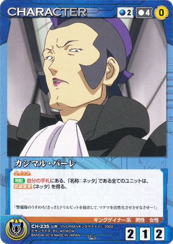 ![]() ![]() | CH-235 カシマル・バーレ CHARACTER サンライズクルセイド 第19弾 ~戦場に集う英雄~ U 色:青 コスト[指定/合計(資源)]:青2/4(0) G:青 攻撃力:2 支援力:1 防御力:2 特徴:キングゲイナー系/男性/女性 クイック 【常駐】自分の手札にある、「名称:ネッタ」である全てのユニットは、武装変更〔ネッタ〕を得る。 「警備隊のうすのろ!さっさとドリルビットを放出して、マグマを活性化させさせなさせー!」 出典:OVERMANキングゲイナー |