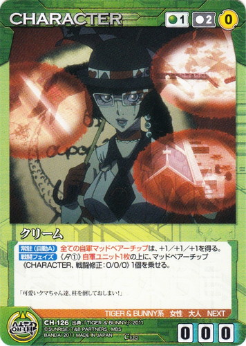 ![]() ![]() | CH-126 クリーム CHARACTER サンライズクルセイド エピソードブースターパック ~TIGER&BUNNY~ C 色:緑 コスト[指定/合計(資源)]:緑1/2(0) G:緑 攻撃力:0 支援力:0 防御力:0 特徴:TIGER&BUNNY系/女性/大人/NEXT 【常駐(自動A)】全ての自軍マッドベアーチップは、+1/+1/+1を得る。 【戦闘フェイズ】《R①》自軍ユニット1枚の上に、マッドベアーチップ《CHARACTER、戦闘修正:0/0/0》1個を乗せる。 「可愛いクマちゃん達、柱を倒しておしまい!」 出典:TIGER&BUNNY |