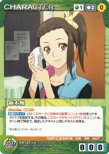 ![]() ![]() | CH-127 鏑木楓 CHARACTER サンライズクルセイド エピソードブースターパック ~TIGER&BUNNY~ U 色:緑 コスト[指定/合計(資源)]:緑1/2(0) G:緑 攻撃力:0 支援力:0 防御力:0 特徴:TIGER&BUNNY系/女性/子供/NEXT パートナー 装填(1) 【防御ステップ】《①》このカードと交戦中の敵軍ユニット1枚が持つテキスト1つを指定する。その場合、このカードがセットされているユニットは、ターン終了時まで、指定したテキストと同じテキストを得る。 「私の能力ってコピーなんだって」 出典:TIGER&BUNNY |