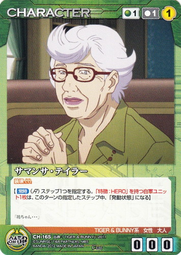![]() ![]() | CH-165 サマンサ・テイラー CHARACTER サンライズクルセイド エピソードブースターパック ~TIGER&BUNNY 第2弾~ C 色:緑 コスト[指定/合計(資源)]:緑1/1① G:緑 攻撃力:0 支援力:0 防御力:0 特徴:TIGER&BUNNY系/女性/大人 装填(1) 【【常時】《R》ステップ1つを指定する。「特徴:HERO」を持つ自軍ユニット1枚は、このターンの指定したステップ中、「発動状態」になる】 「坊ちゃん・・・」 出典:TIGER&BUNNY |