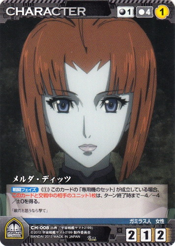 ![]() ![]() | CH-008 メルダ・ディッツ CHARACTER 【クルセイド】宇宙戦艦ヤマト2199 R 色:黒 コスト[指定/合計(資源)]:黒1/4① G:黒 攻撃力:2 支援力:1 防御力:2 特徴:ガミラス人/女性 【戦闘フェイズ】《①》このカードの「専用機のセット」が成立している場合、このカードと交戦中の相手のユニット1枚は、ターン終了時まで-4/-4/±0を得る。 敵だと思うなら撃て」 出典:宇宙戦艦ヤマト2199 |