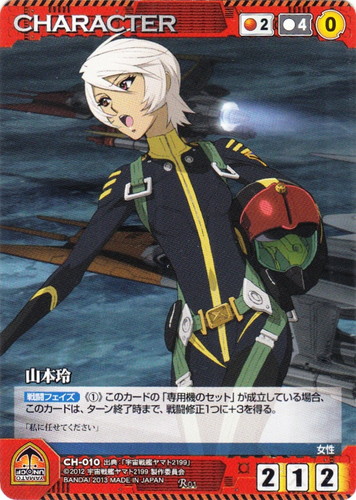 ![]() ![]() | CH-010 山本怜 CHARACTER 【クルセイド】宇宙戦艦ヤマト2199 R 色:赤 コスト[指定/合計(資源)]:赤2/4(0) G:赤 攻撃力:2 支援力:1 防御力:2 特徴:女性 【戦闘フェイズ】《①》このカードの「専用機のセット」が成立している場合、このカードは、ターン終了時まで、戦闘修正1つに+3を得る。 「私に任せてください」 出典:宇宙戦艦ヤマト2199 |