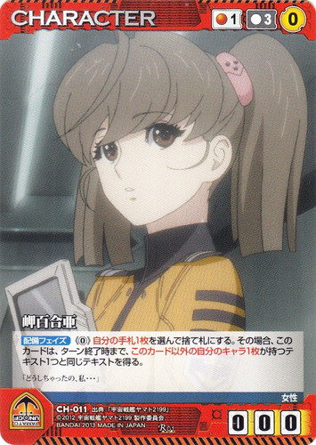 ![]() ![]() | CH-011 岬百合亜 CHARACTER 【クルセイド】宇宙戦艦ヤマト2199 R 色:赤 コスト[指定/合計(資源)]:赤1/3(0) G:赤 攻撃力:0 支援力:0 防御力:0 特徴:女性 【配備フェイズ】《0》自分の手札1枚を選んで捨て札にする。その場合、このカードは、ターン終了時まで、このカード以外の自分のキャラ1枚が持つテキスト1つと同じテキストを得る。 「どうしちゃったの、私・・・」 出典:宇宙戦艦ヤマト2199 |