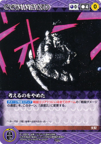 ![]() ![]() | C-003 考えるのをやめた COMMAND 構築済みデッキセット ジョジョの奇妙な冒険 D 色:紫 コスト[指定/合計(資源)]:紫0/4(0) G:紫 特徴:支配 【ダメージ判定ステップ】戦闘エリア1つにいる全てのチームの「戦闘ダメージの速度」を、このターン、「速度2」に変更する。 「ーカーズはー2度と地球へは戻れなかった・・・」 出典:ジョジョの奇妙な冒険 |