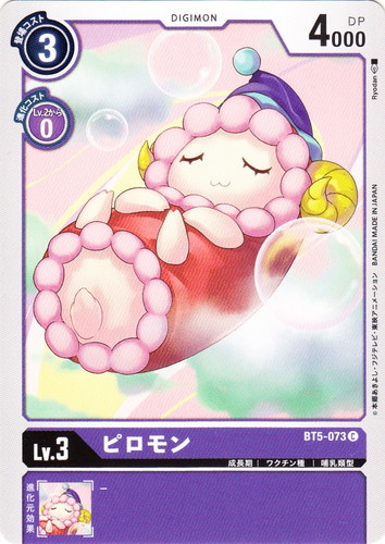 ![]() ![]() | BT5-073 ピロモン デジモン ブースターパック バトルオブオメガ C 色:紫 レベル:3 登場コスト:3 進化コスト1:紫Lv.2から0 DP:4000 形態:成長期 属性:ワクチン種 タイプ:哺乳類型 イラストレーター:Ryodan |