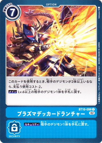 ![]() ![]() | BT10-098 プラズマデッカードランチャー オプション ブースターパック クロスエンカウンター C 色:青 登場コスト:7 ブロック:02 このカードを使用するとき、相手のデジモンが2体以上いるなら、支払う使用コスト-2。 【メイン】Lv.6以上の相手のデジモン1体を手札に戻す。 【セキュリティ】相手のデジモン1体を手札に戻す。 イラストレーター:hokuyuu |