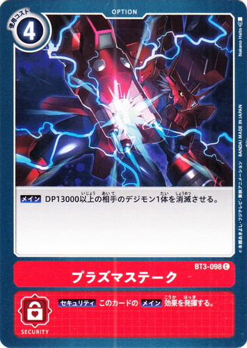 ![]() ![]() | BT3-098 プラズマステーク オプション ブースターパック ユニオンインパクト C 色:赤 登場コスト:4 【メイン】DP13000以上の相手のデジモン1体を消滅させる。 【セキュリティ】このカードの【メイン】効果を発揮する。 イラストレーター:Nakano Halto |
