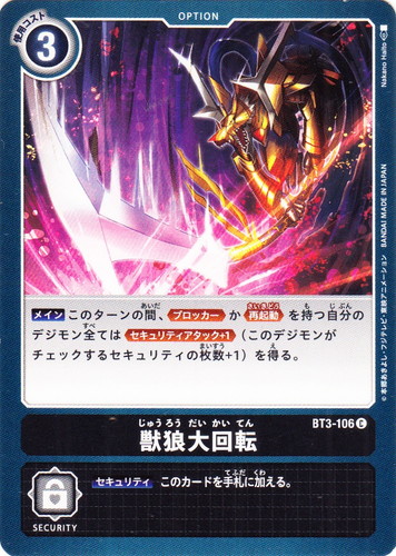 ![]() ![]() | BT3-106 獣狼大回転 オプション ブースターパック ユニオンインパクト C 色:黒 登場コスト:3 【メイン】このターンの間、【ブロッカー】か【再起動】を持つ自分のデジモン全ては【セキュリティアタック+1】(このデジモンがチェックするセキュリティの枚数+1)を得る。 【セキュリティ】このカードを手札に加える。 イラストレーター:Nakano Halto |