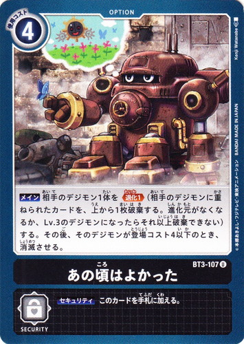 ![]() ![]() | BT3-107 あの頃はよかった オプション ブースターパック ユニオンインパクト U 色:黒 登場コスト:4 【メイン】相手のデジモン1体を、【退化1】(相手のデジモンに重ねられたカードを、上から1枚破棄する。進化元がなくなるか、Lv.3のデジモンになったらそれ以上破棄できない)する。その後、そのデジモンが登場コスト4以下のとき、消滅させる。 【セキュリティ】このカードを手札に加える。 イラストレーター:Kenji Watanabe |