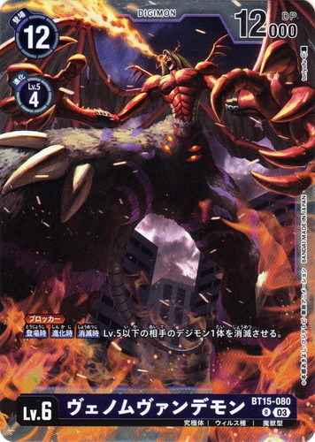 ![]() ![]() | BT15-080 ヴェノムヴァンデモン デジモン ブースターパック エクシード・アポカリプス R 色:黒 レベル:6 登場コスト:12 進化コスト1:黒Lv.5から4 DP:12000 形態:究極体 属性:ウィルス種 タイプ:魔獣型 ブロック:03 【ブロッカー】 【登場時】【進化時】【消滅時】Lv.5以下の相手のデジモン1体を消滅させる。 イラストレーター:toriyufu |