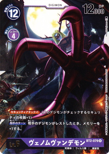 ![]() ![]() | BT2-079 ヴェノムヴァンデモン デジモン ブースターパック ULTIMATE POWER R 色:紫 レベル:6 登場コスト:12 進化コスト1:紫Lv.5から4 DP:12000 形態:究極体 属性:ウィルス種 タイプ:魔獣型 【セキュリティアタック+1】(このデジモンがチェックするセキュリティの枚数+1) 【相手のターン】相手のデジモンがレストしたとき、メモリーを+1する。 イラストレーター:Hisashi Fujiwara |