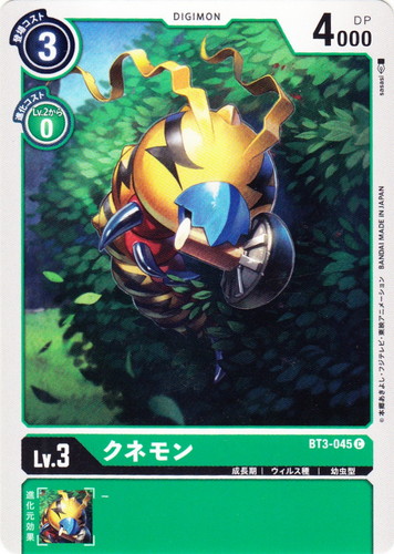 ![]() ![]() | BT3-045 クネモン デジモン ブースターパック ユニオンインパクト C 色:緑 レベル:3 登場コスト:3 進化コスト1:緑Lv.2から0 DP:4000 形態:成長期 属性:ウィルス種 タイプ:幼虫型 イラストレーター:sasasi |