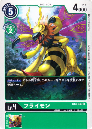 ![]() ![]() | BT3-049 フライモン デジモン ブースターパック ユニオンインパクト U 色:緑 レベル:4 登場コスト:5 進化コスト1:緑Lv.3から2 DP:4000 形態:成熟期 属性:ウィルス種 タイプ:昆虫型 【セキュリティ】バトル終了時、このカードをコストを支払わずに登場させる。 イラストレーター:Hisashi Fujiwara |