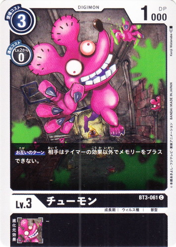 ![]() ![]() | BT3-061 チューモン デジモン ブースターパック ユニオンインパクト C 色:黒 レベル:3 登場コスト:3 進化コスト1:黒Lv.2から0 DP:1000 形態:成長期 属性:ウィルス種 タイプ:獣型 【お互いのターン】相手はテイマーの効果以外でメモリーをプラスできない。 イラストレーター:Kenji Watanabe |