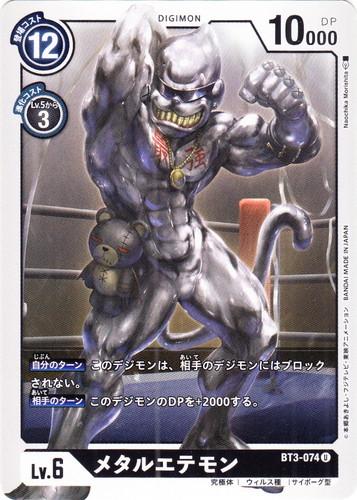 ![]() ![]() | BT3-074 メタルエテモン デジモン ブースターパック ユニオンインパクト U 色:黒 レベル:6 登場コスト:12 進化コスト1:黒Lv.5から3 DP:10000 形態:究極体 属性:ウィルス種 タイプ:サイボーグ型 【自分のターン】このデジモンは、相手のデジモンにはブロックされない。 【相手のターン】このデジモンのDPを+2000する。 イラストレーター:Naochika Morishita |