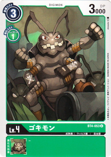 ![]() ![]() | BT4-053 ゴキモン デジモン ブースターパック グレイトレジェンド U 色:緑 レベル:4 登場コスト:3 進化コスト1:緑Lv.3から1 DP:3000 形態:成熟期 属性:ウィルス種 タイプ:昆虫型 イラストレーター:shosuke |
