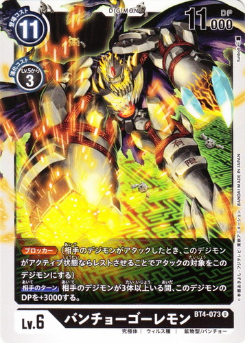 ![]() ![]() | BT4-073 バンチョーゴーレモン デジモン ブースターパック グレイトレジェンド U 色:黒 レベル:6 登場コスト:11 進化コスト1:黒Lv.5から3 DP:11000 形態:究極体 属性:ウィルス種 タイプ:鉱物型/バンチョー 【ブロッカー】(相手のデジモンがアタックしたとき、このデジモンがアクティブ状態ならレストさせることでアタックの対象をこのデジモンにする) 【相手のターン】相手のデジモンが3体以上いる間、このデジモンのDPを+3000する。 イラストレーター:funbolt |