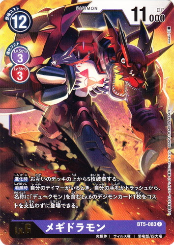 ![]() ![]() | BT5-083 メギドラモン デジモン ブースターパック バトルオブオメガ R 色:紫 レベル:6 登場コスト:12 進化コスト1:紫Lv.5から3 進化コスト2:赤Lv.5から3 DP:11000 形態:究極体 属性:ウィルス種 タイプ:邪竜型/四大竜 【進化時】お互いのデッキの上から5枚破棄する。 【消滅時】自分のテイマーがいるとき、自分の手札かトラッシュから、名称に「デュークモン」を含むLv.6のデジモンカード1枚をコストを支払わずに登場できる。 イラストレーター:sasasi |
