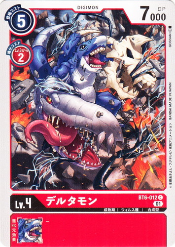 ![]() ![]() | BT6-012 デルタモン デジモン ブースターパック ダブルダイヤモンド C 色:赤 レベル:4 登場コスト:5 進化コスト1:赤Lv.3から2 DP:7000 形態:成熟期 属性:ウィルス種 タイプ:合成型 ブロック:01 イラストレーター:GOSSAN |