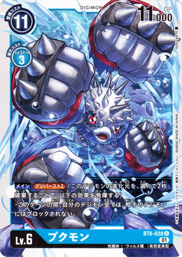 ![]() ![]() | BT6-028 プクモン デジモン ブースターパック ダブルダイヤモンド U 色:青 レベル:6 登場コスト:11 進化コスト1:青Lv.5から3 DP:11000 形態:究極体 属性:ウィルス種 タイプ:突然変異型 ブロック:01 【メイン】【デジバースト2】(このデジモンの進化元を、選んで2枚破棄することで、以下の効果を発揮する) ・このターンの間、自分のデジモン全ては、相手のデジモンにはブロックされない。 イラストレーター:GOSSAN |