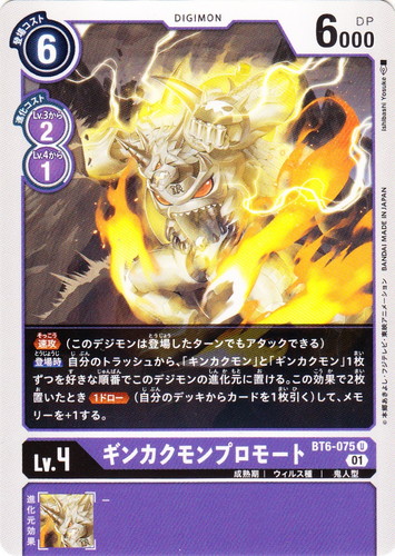 ![]() ![]() | BT6-075 ギンカクモンプロモート デジモン ブースターパック ダブルダイヤモンド U 色:紫 レベル:4 登場コスト:6 進化コスト1:紫Lv.3から2 進化コスト2:紫Lv.4から1 DP:6000 形態:成熟期 属性:ウィルス種 タイプ:鬼人型 ブロック:01 【速攻】(このデジモンは登場したターンでもアタックできる) 【登場時】自分のトラッシュから、「キンカクモン」と「ギンカクモン」1枚ずつを好きな順番でこのデジモンの進化元に置ける。この効果で2枚置いたとき【1ドロー】(自分のデッキからカードを1枚引く)して、メモリーを+1する。 イラストレーター:Ishibashi Yosuke |