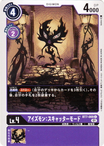 ![]() ![]() | BT7-069 アイズモン:スキャッターモード デジモン ブースターパック ネクストアドベンチャー C 色:紫 レベル:4 登場コスト:4 進化コスト1:紫Lv.3から2 DP:4000 形態:成熟期 属性:ウィルス種 タイプ:魔竜型 ブロック:01 【消滅時】【3ドロー】(自分のデッキからカードを3枚引く)。その後、自分の手札を2枚破棄する。 イラストレーター:Itohiro |