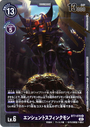 ![]() ![]() | BT7-078 エンシェントスフィンクモン デジモン ブースターパック ネクストアドベンチャー R 色:紫 レベル:6 登場コスト:13 進化コスト1:紫Lv.5から5 DP:13000 形態:究極体 属性:ウィルス種 タイプ:古代幻獣型/十闘士 ブロック:01 【進化時】特徴に「十闘士」か「ハイブリッド体」を持つ自分のデジモン1体を消滅させることで、消滅したデジモンのLv.以下の相手のデジモン1体を消滅させる。 【消滅時】自分の手札から、特徴に「ハイブリッド体」を持つ紫のLv.4以下のカード1枚をコストを支払わずに登場できる。 イラストレーター:Hisashi Fujiwara |